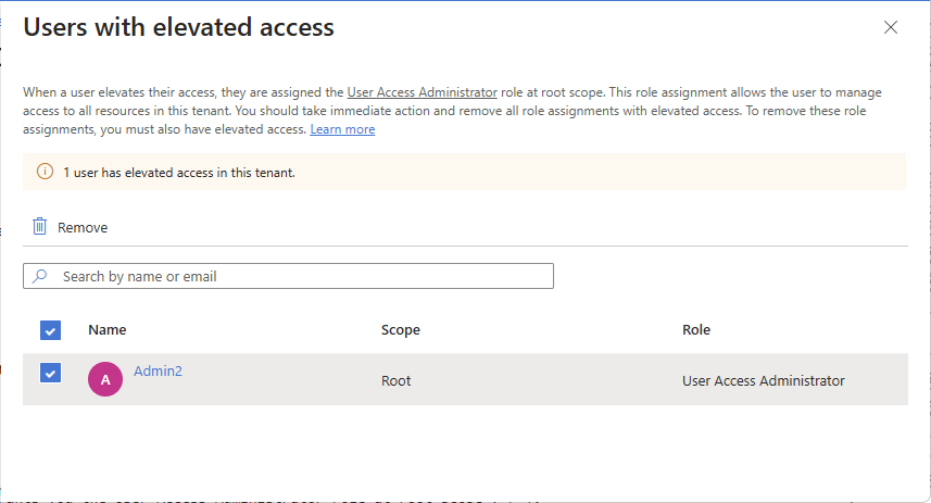If you have users with elevated access, you should take immediate action and remove that access. To remove these role assignments, you must also have elevated access. This section describes how to remove elevated access for users in your tenant using the Azure portal. This capability is being deployed in stages, so it might not be available yet in your tenant.