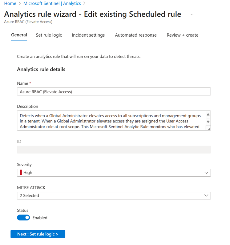 Create an elevate access analytics rule by following the steps at Create a rule from a template.