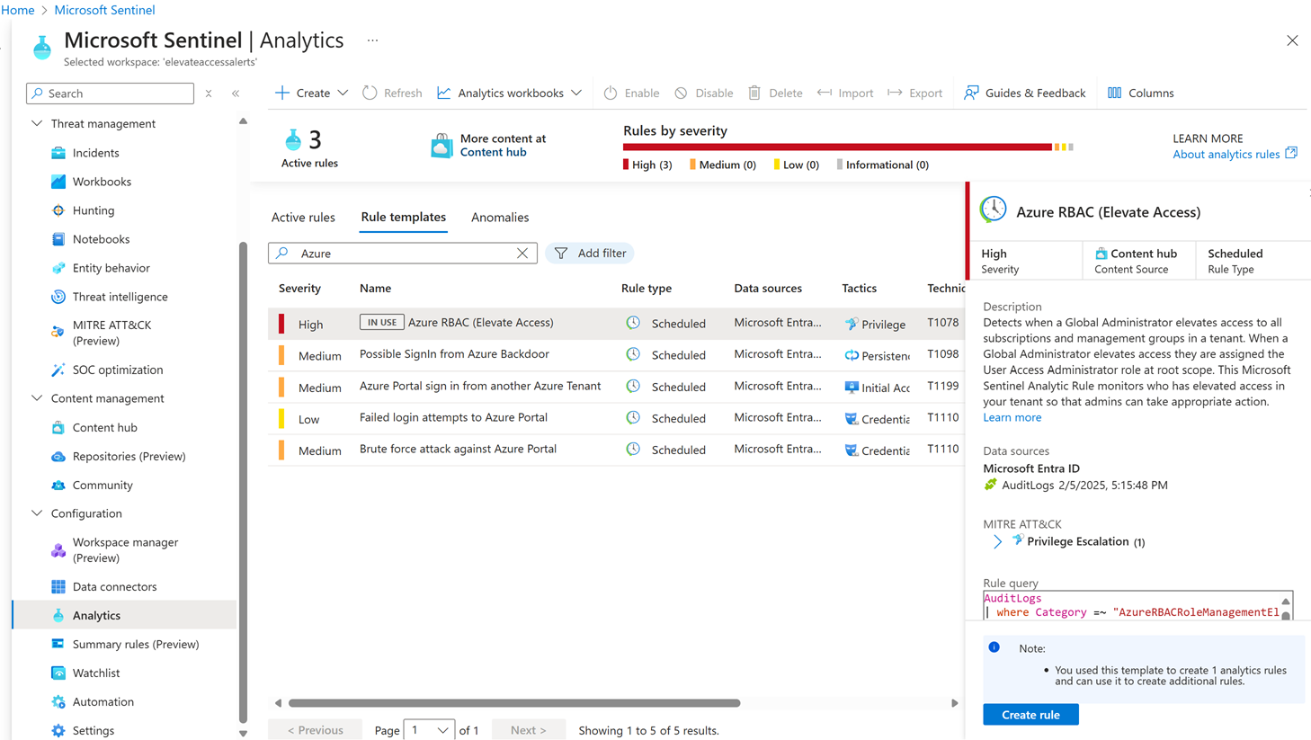Select the Azure RBAC (Elevate Access) template then select the Create rule button on the details pane.