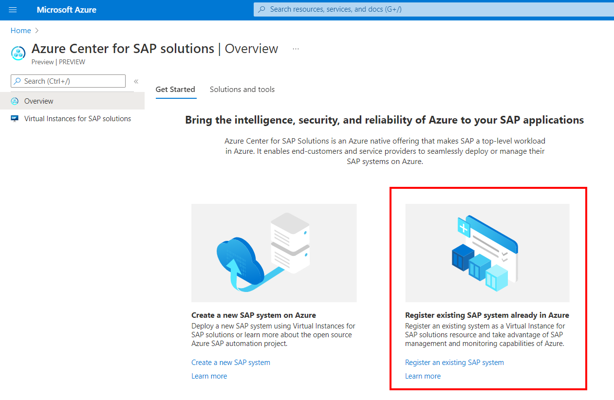 On the Azure Center for SAP solutions page, select Register an existing SAP system.