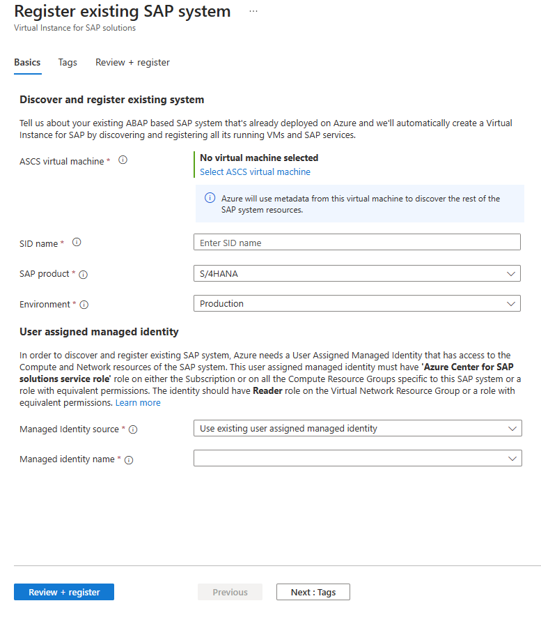 Azure Center for SAP solutions uses this user-assigned managed identity to install VM extensions on the ASCS, Application Server and DB VMs. This step allows Azure Center for SAP solutions to discover the SAP system components, and other SAP system metadata. User-assigned managed identity is required to enable SAP system monitoring and management capabilities.