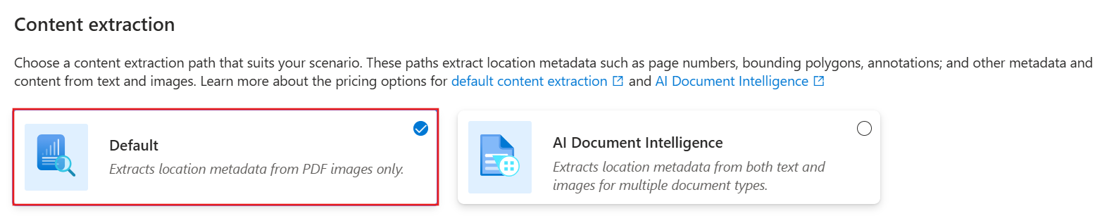 For content extraction, you can choose either default extraction via Azure AI Search or enhanced extraction via Azure Document Intelligence in Foundry Tools. The following table describes both extraction methods.