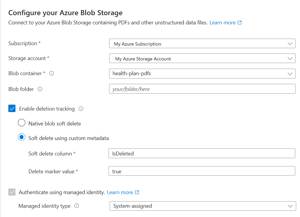 If you configured your blobs for soft delete, provide the metadata property name-value pair. We recommend IsDeleted. If IsDeleted is set to true on a blob, the indexer drops the corresponding search document on the next indexer run.