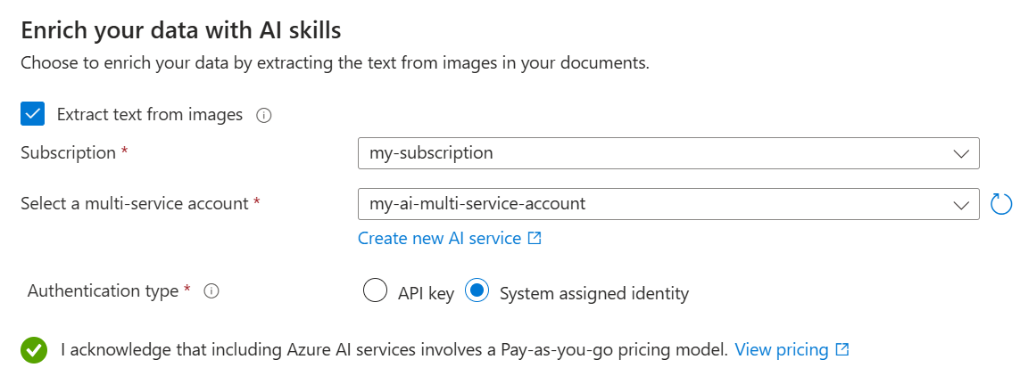 4 For billing purposes, you must attach your Foundry resource to the skillset in your Azure AI Search service. Unless you use a keyless connection (preview) to create the skillset, both resources must be in the same region.