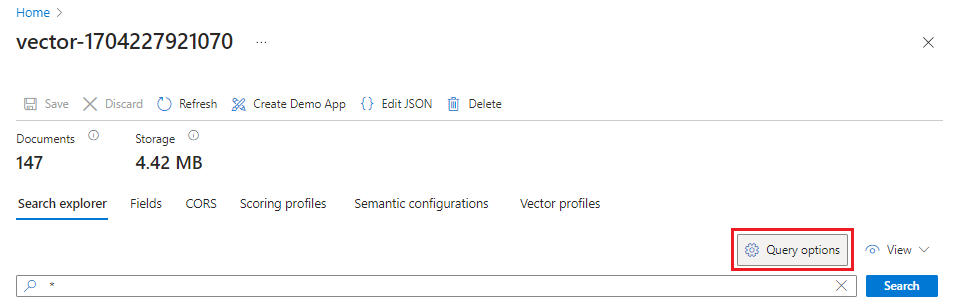 "*") but includes parameters for returning the number matches. It's a hybrid query that runs text and vector queries in parallel. It also includes semantic ranking and specifies which fields to return in the results through theselectstatement.{ "search": "*", "count": true, "vectorQueries": [ { "kind": "text", "text": "*", "fields": "text_vector,image_vector" } ], "queryType": "semantic", "semanticConfiguration": "my-demo-semantic-configuration", "captions": "extractive", "answers": "extractive|count-3", "queryLanguage": "en-us", "select": "chunk_id,text_parent_id,chunk,title,image_parent_id" }Replace both asterisk (