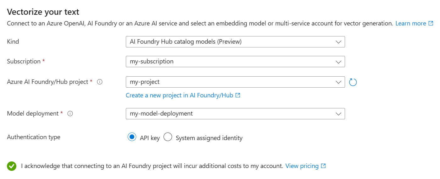 | Microsoft Foundry project | For text: text-embedding-ada-002 text-embedding-3-small text-embedding-3-large |