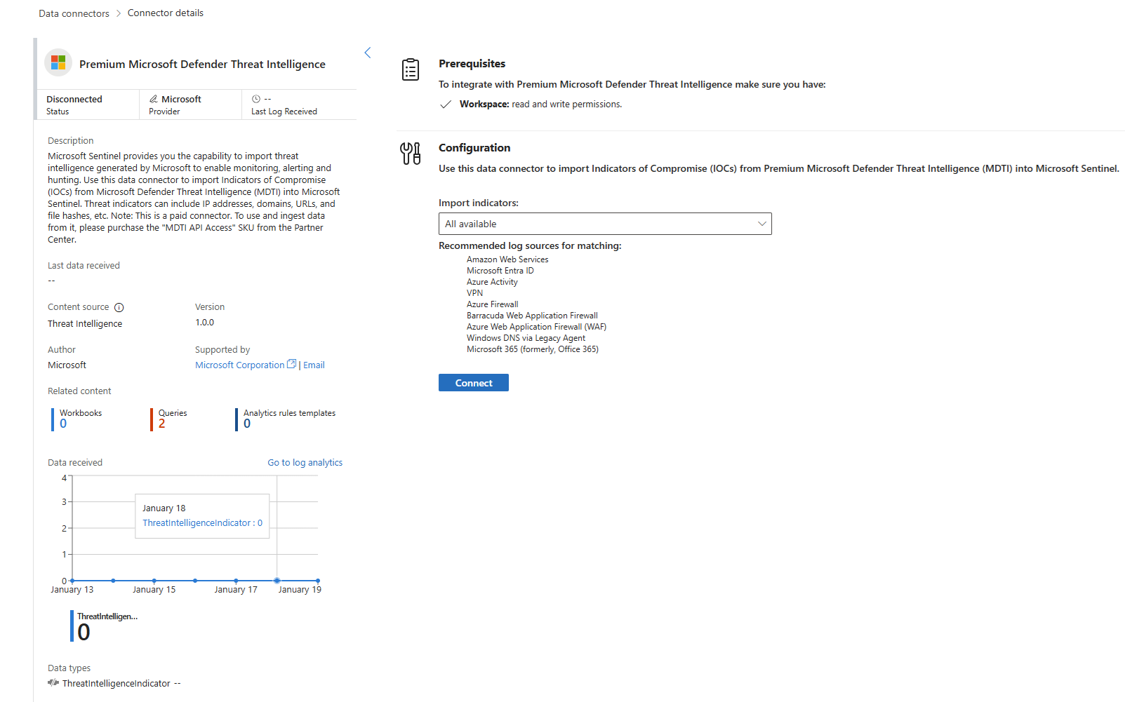 Bring public, open-source and high-fidelity indicators of compromise (IOCs) generated by Microsoft Defender Threat Intelligence into your Microsoft Sentinel workspace with the Defender Threat Intelligence data connectors. With a simple one-click setup, use the threat intelligence from the standard and premium Defender Threat Intelligence data connectors to monitor, alert, and hunt.
