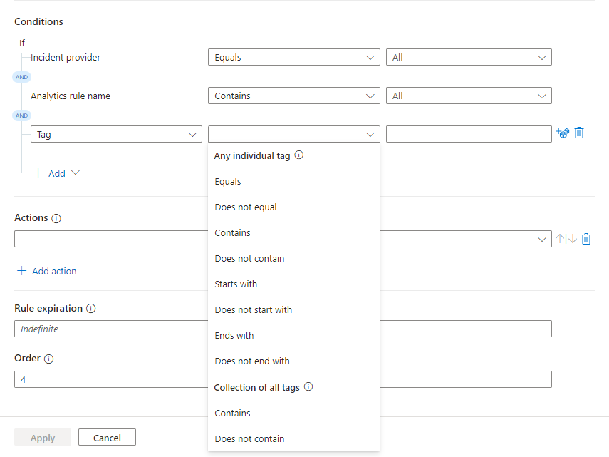 - Analytic rule name- Contains/Does not contain Conditions available with the update trigger