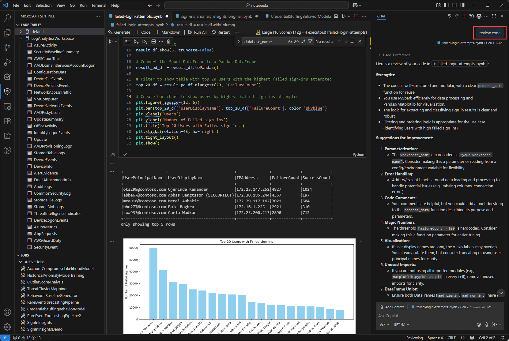 Jupyter notebooks provide an interactive environment for exploring, analyzing, and visualizing data in the Microsoft Sentinel data lake. With notebooks, you can write and execute code, document your workflow, and view results—all in one place. This makes it easy to perform data exploration, build advanced analytics solutions, and share insights with others. By leveraging Python and Apache Spark within Visual Studio Code, notebooks help you transform raw security data into actionable intelligence.