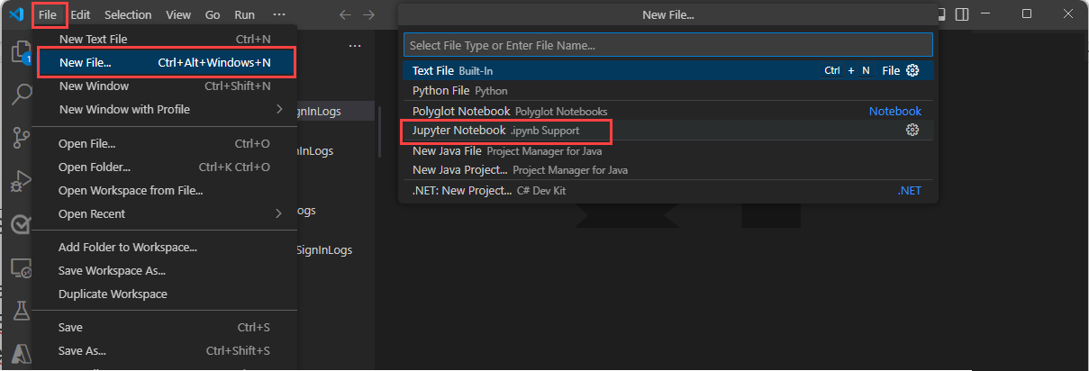 Enter > in the search box or press Ctrl+Shift+P and then enter Create New Jupyter Notebook.