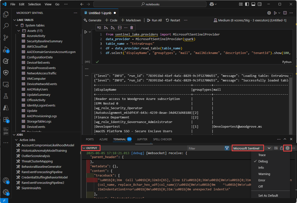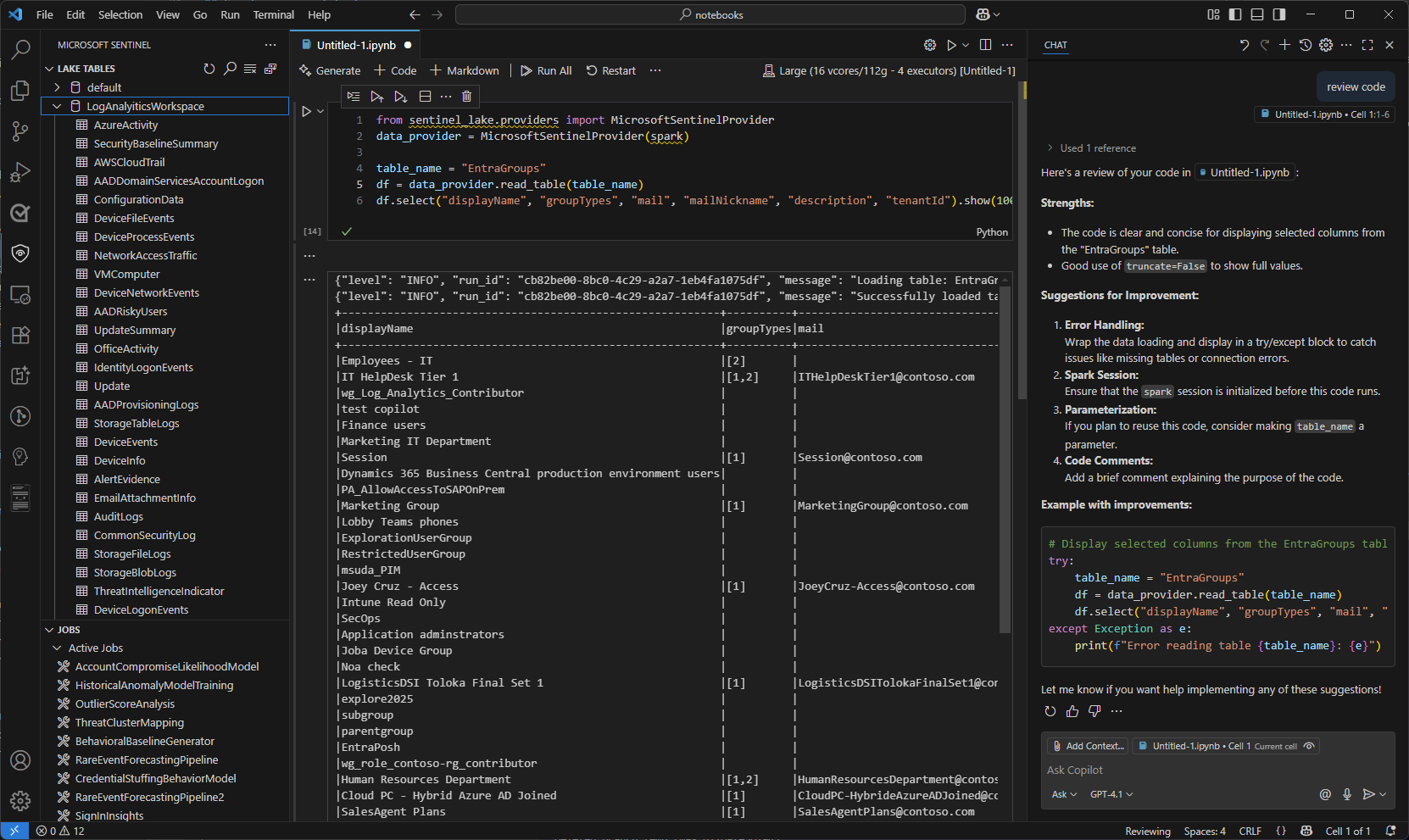 from sentinel_lake.providers import MicrosoftSentinelProvider data_provider = MicrosoftSentinelProvider(spark) table_name = "EntraGroups" df = data_provider.read_table(table_name) df.select("displayName", "groupTypes", "mail", "mailNickname", "description", "tenantId").show(100, truncate=False)