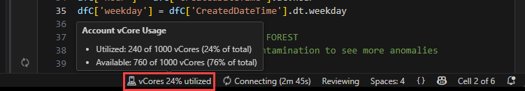 | Session start-up time | Spark compute session takes about 5-6 minutes to start. You can view the status of the session at the bottom of your VS Code Notebook. |