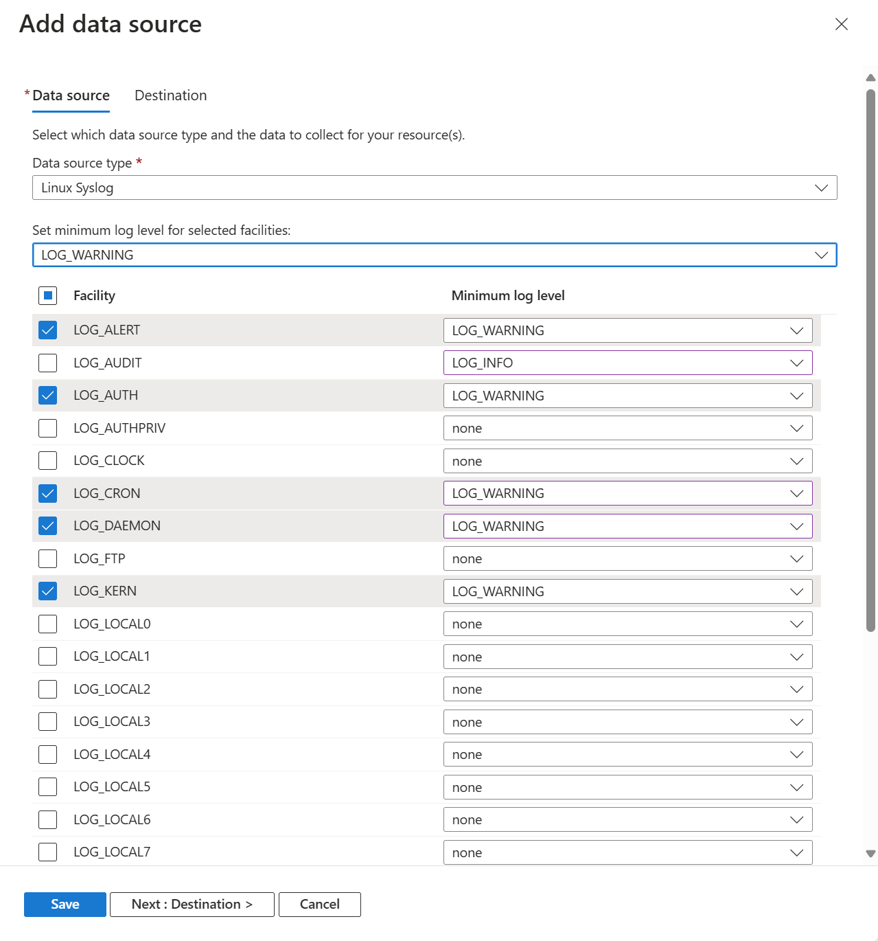 For the full procedure of configuring Syslog data collection, see Collect Syslog events with Azure Monitor Agent.