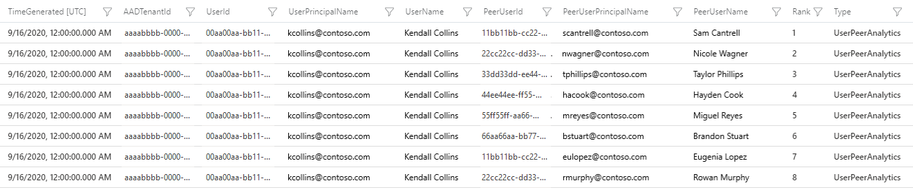 Microsoft Sentinel calculates and ranks a user's peers, based on the user’s Microsoft Entra security group membership, mailing list, et cetera, and stores the peers ranked 1-20 in the UserPeerAnalytics table. The screenshot below shows the schema of the UserPeerAnalytics table, and displays the top eight-ranked peers of the user Kendall Collins. Microsoft Sentinel uses the term frequency-inverse document frequency (TF-IDF) algorithm to normalize the weighing for calculating the rank: the smaller the group, the higher the weight.