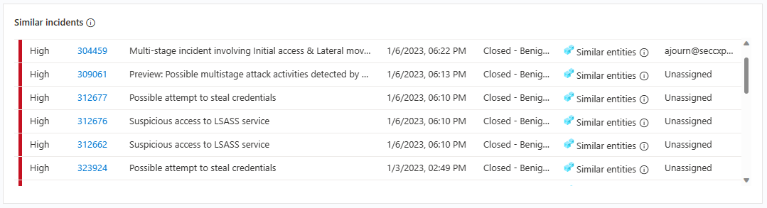 The widget shows you the 20 most similar incidents. Microsoft Sentinel decides which incidents are similar based on common elements including entities, the source analytics rule, and alert details. From this widget you can jump directly to any of these incidents' full details pages, while keeping the connection to the current incident intact.