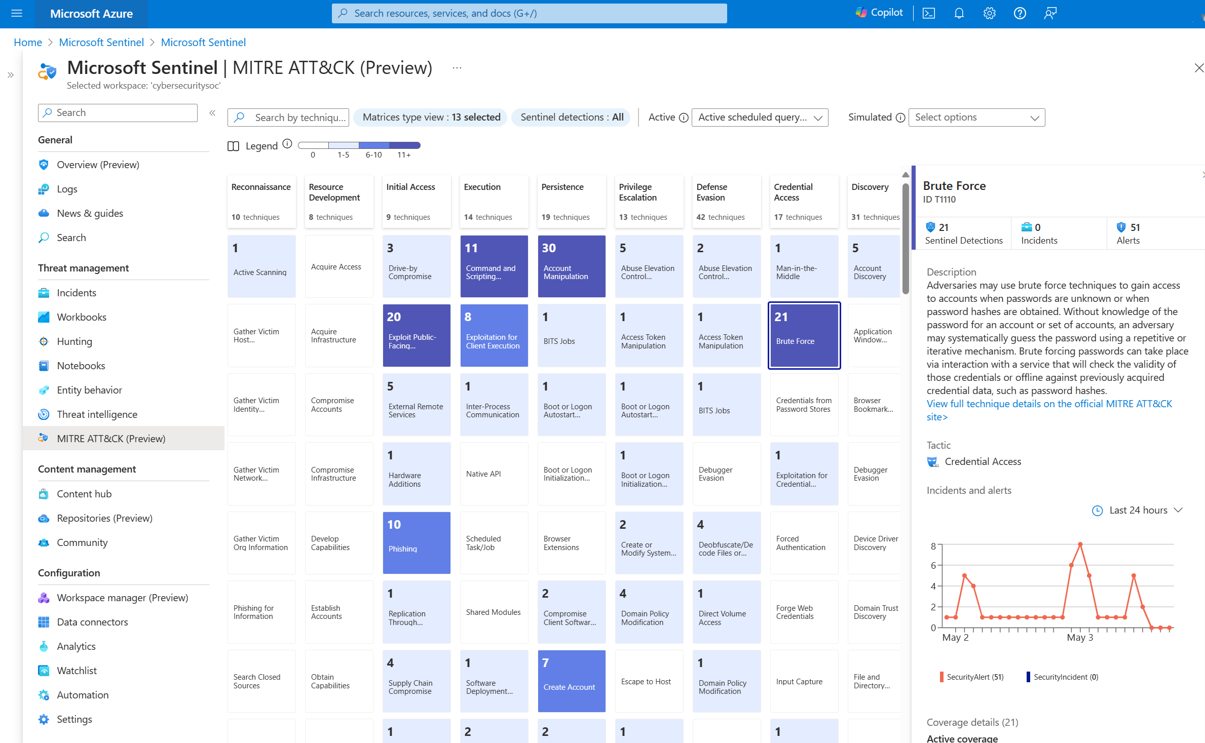 | MITRE ATT&CK coverage | Microsoft Sentinel analyzes ingested data, not only to detect threats and help you investigate, but also to visualize the nature and coverage of your organization's security status based on the tactics and techniques from the MITRE ATT&CK® framework. | Understand security coverage by the MITRE ATT&CK® framework |