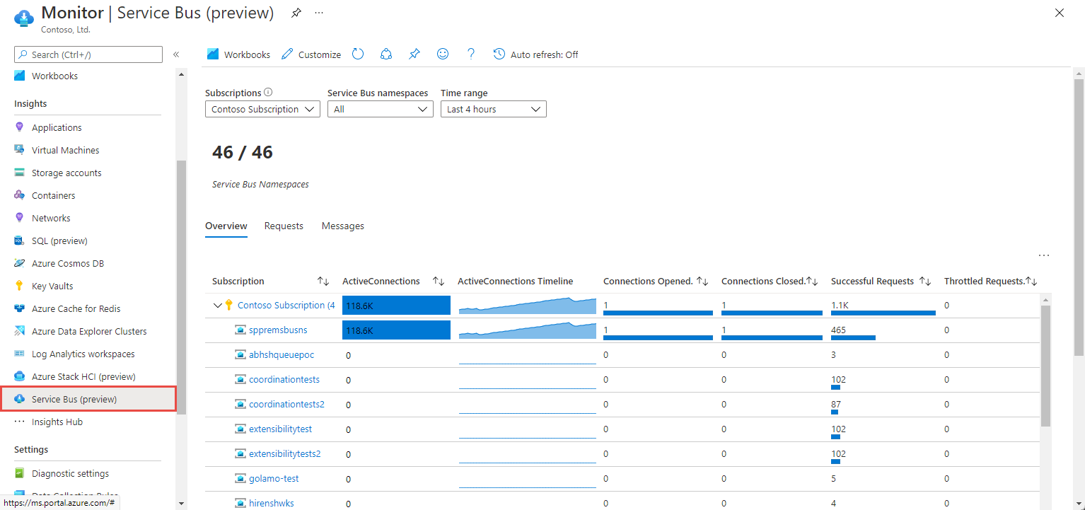 On the Service Bus Namespace page, in the Monitoring section on the left menu, select Insights (preview) or Workbooks to do further analysis. You see the following page when you select Insights (preview).