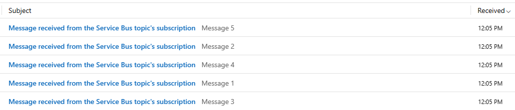 const int numberOfMessages = 5;) to the Service Bus topic.