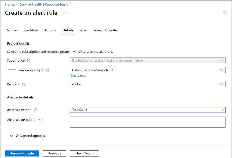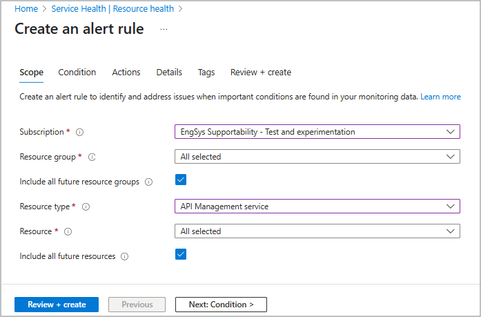 Scope defines which resources your alert monitors. In this tab, you select the subscription, resource group, or individual resources that matter most to your business. This information is needed because Resource health alerts only trigger for the resources you include in the scope.