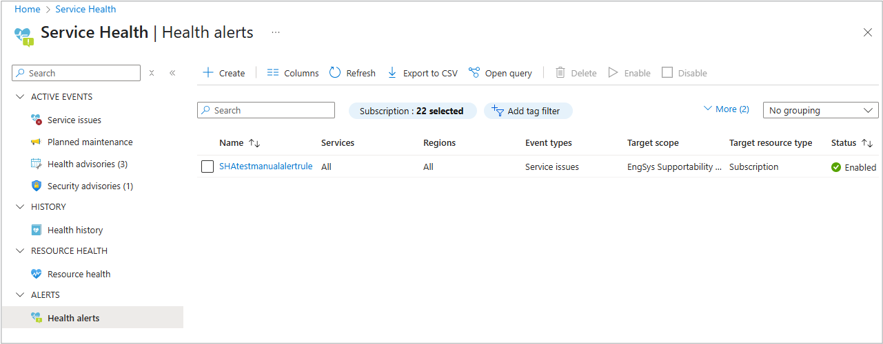 For steps on how to create a Resource Health alert, see Create a Resource Health alert.