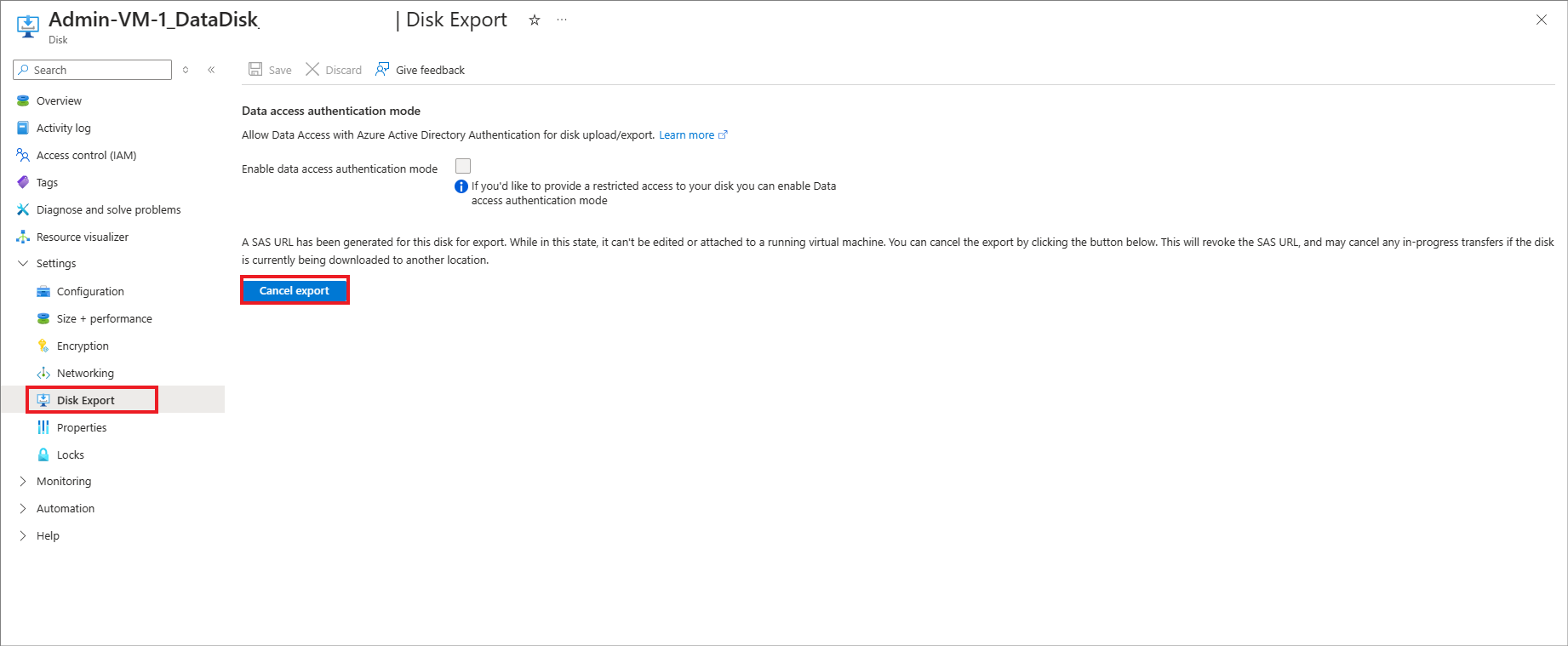 You can change the network access of the disk only if you have canceled the export. If you do not cancel the export, network access change for the disk is disabled.