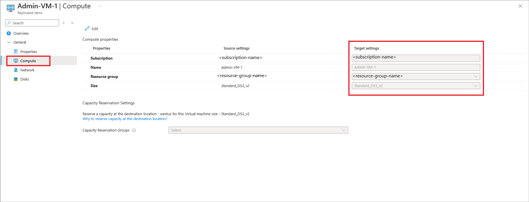 Find the target subscription name and target resource group name in the Compute tab. The replica disks are in the target subscription and target resource group. The failover and test failover virtual machines are also created in the target resource group within target subscription.