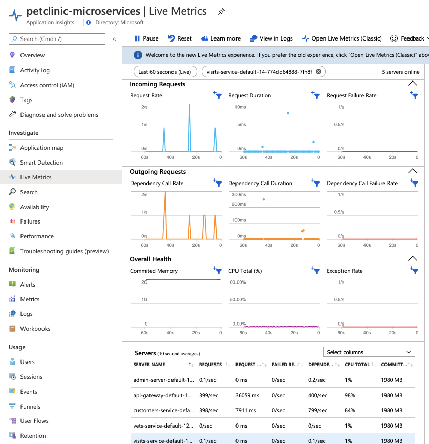 In the navigation pane, select Live Metrics to see the real-time metrics for different dimensions.