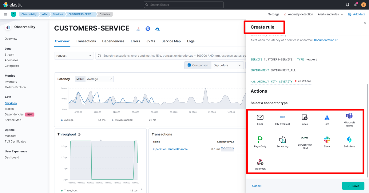Using the inbuilt AI engine in the Elastic solution, you can also enable Anomaly Detection on the Azure Spring Apps Services and choose an appropriate action - such as Teams notification, creation of a JIRA issue, a webhook-based API call, and others.