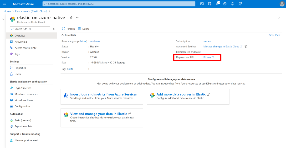In the Azure portal, go to the Overview page of your Elastic deployment, then select Manage Elastic Cloud Deployment.