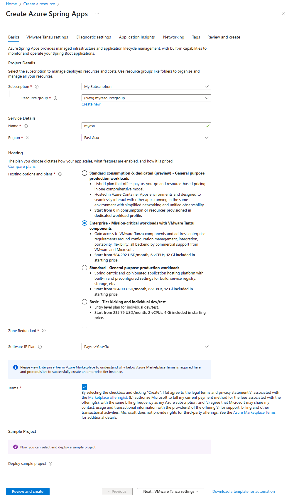 Select Review and Create to review your selections. Then, select Create to provision the Azure Spring Apps instance.