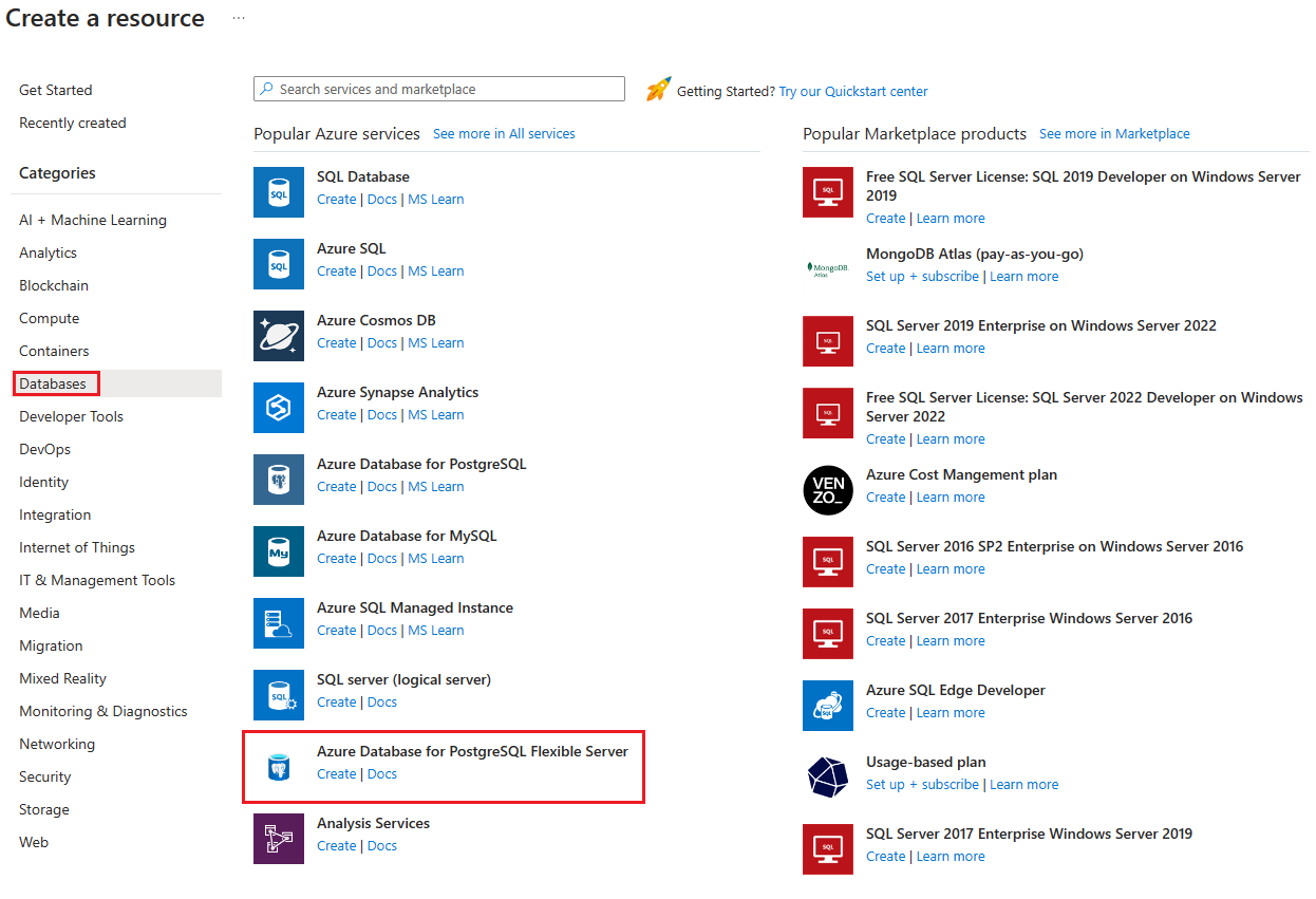 Select Databases > Azure Database for PostgreSQL Flexible Server.