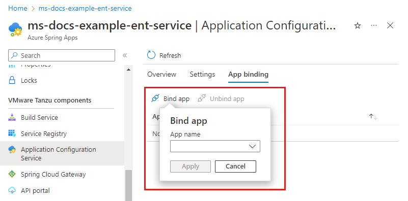 Select the Bind tab and then select Application Configuration Service from the dropdown.
