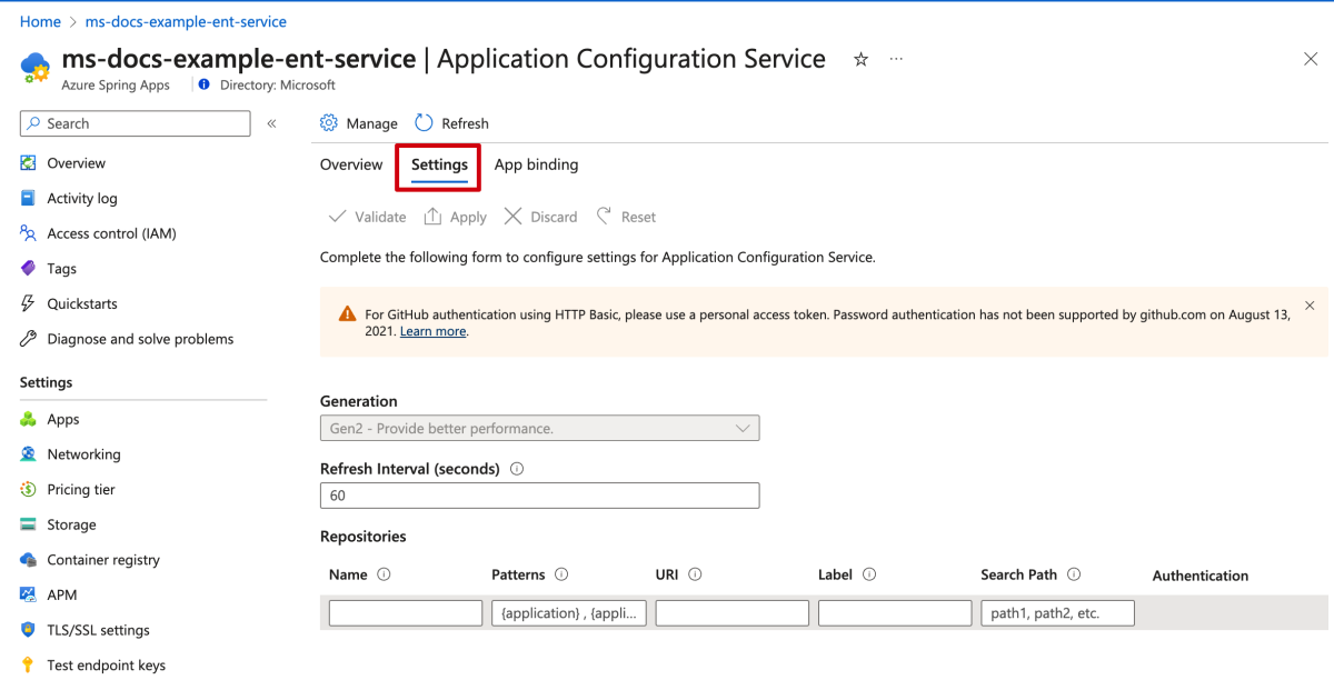 In the Azure portal, navigate to the Application Configuration Service page for your Azure Spring Apps service instance.