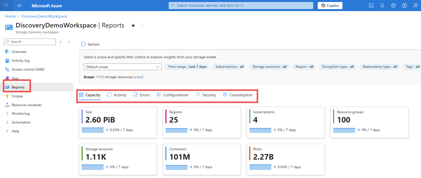- Use reports and Azure Copilot to dive into insights about your storage resources and the data they contain.