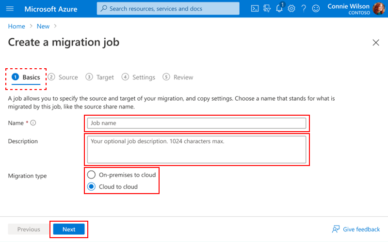 Select the project after it appears, and then select Create job definition. The Create a Migration Job page opens to the Basics tab. Provide values for the following fields: