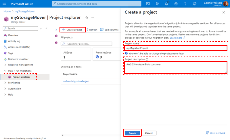 Navigate to the Project explorer tab in your Storage Mover instance and select Create project.