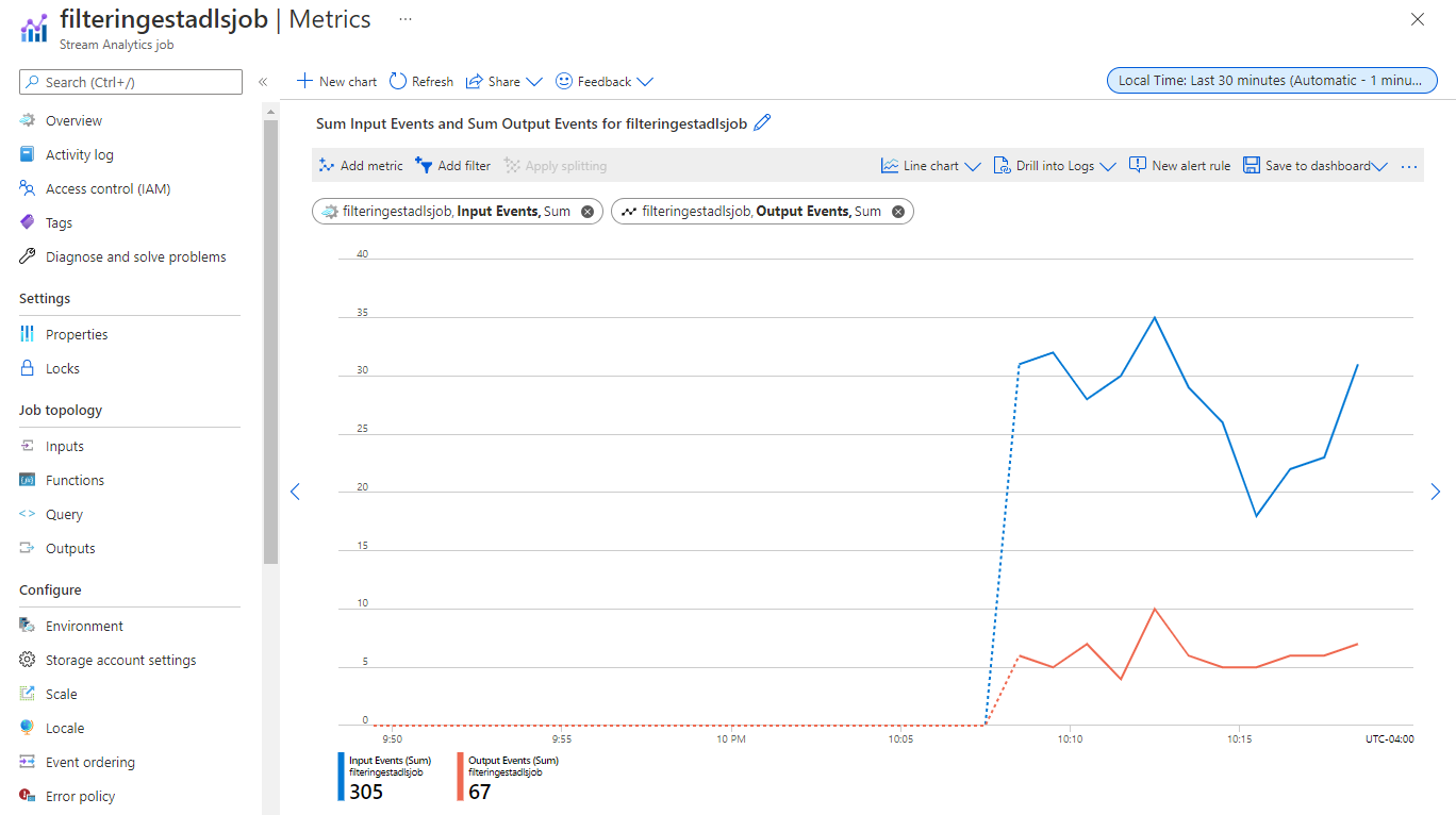 You can see the job under the Process Data section in the Stream Analytics jobs tab. Select Refresh until you see the job status as Running. Select Open metrics to monitor it or stop and restart it, as needed.