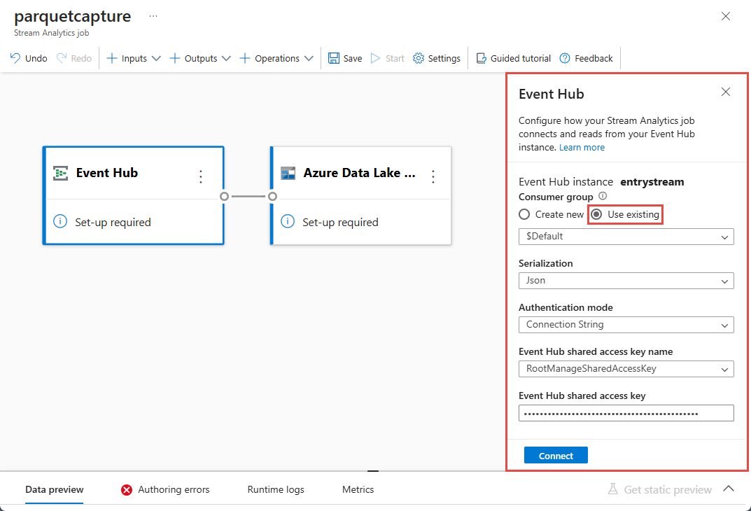 carsummaryand select Create.On the event hub configuration page, confirm the following settings, and then select Connect.