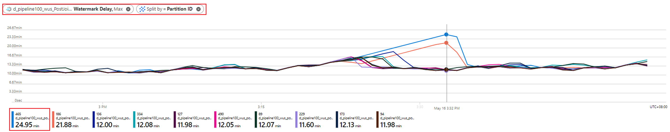 Check which partition has the increasing watermark delay. Select the Watermark Delay metric and split it by the Partition ID dimension. In the following example, partition 465 has a high watermark delay.