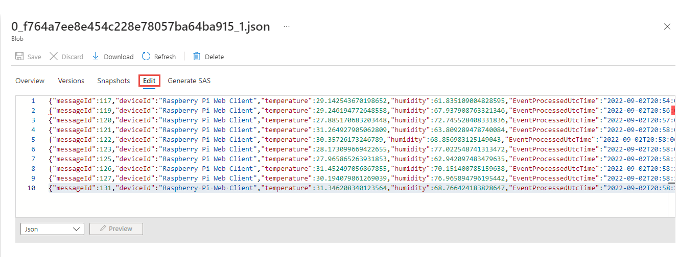 Select the file, and then on the Blob page, select Edit to view contents in the file.