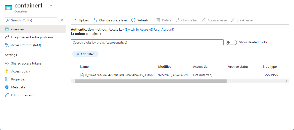 After few minutes, in the portal, find the storage account & the container that you've configured as output for the job. You can now see the output file in the container. The job takes a few minutes to start for the first time, after it's started, it will continue to run as the data arrives.