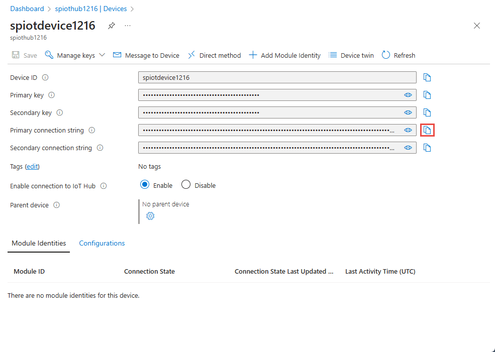 On the device page, select the copy button next to Primary Connection String, and save it to a notepad to use later.