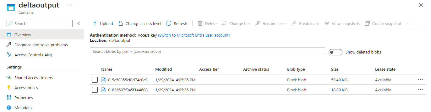 After few minutes, in the portal, find the storage account & the container that you've configured as output for the job. You can now see the delta table in the folder specified in the container. The job takes a few minutes to start for the first time, after it's started, it will continue to run as the data arrives.