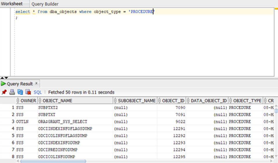 Most modern database products support storing procedures within the database. Oracle provides the PL/SQL language for this purpose. A stored procedure typically contains both SQL statements and procedural logic, and returns data or a status. You can get a list of stored procedures within an Oracle database by querying the ALL_OBJECTS view with the appropriate WHERE clause. You can use Oracle SQL Developer to get a list of stored procedures, as shown in the next screenshot.