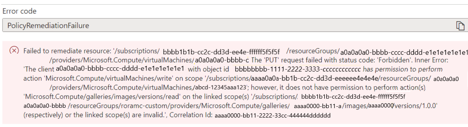 In scenarios where the Contributor role doesn't work when the linked resources (gallery image or disk) are in another resource group or subscription, manually provide the managed identity with the right roles and permissions on the scope to unblock remediations. Follow the steps in Grant permissions to the managed identity through defined roles.
