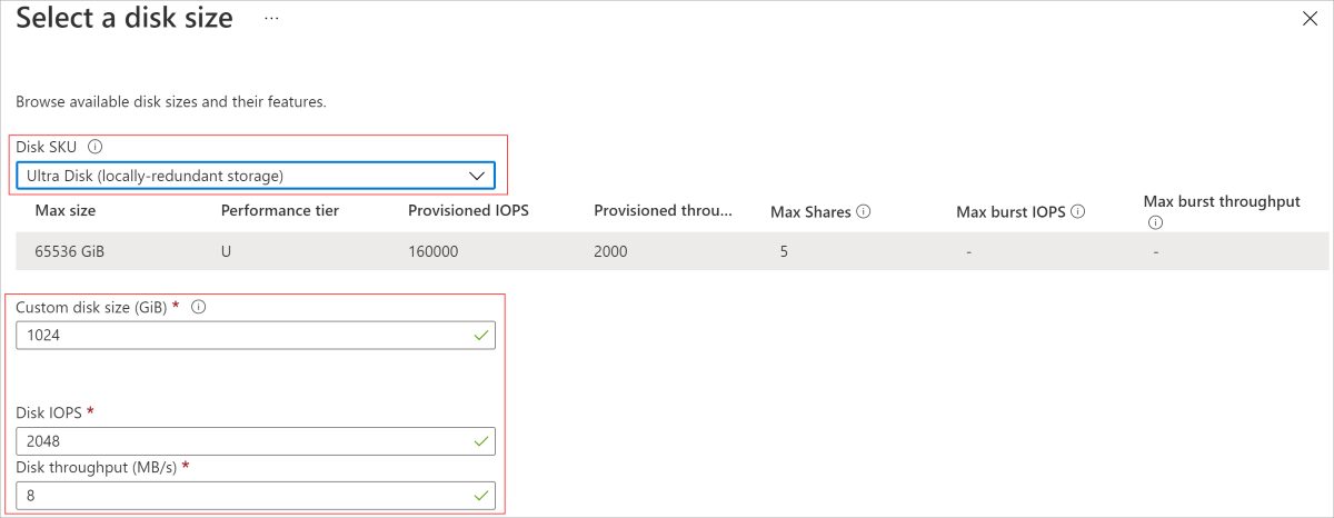 For Disk SKU select Ultra Disk, then fill in the values for the desired performance and select OK.