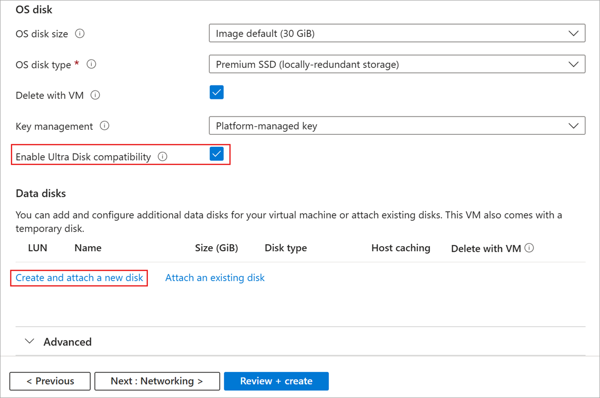 On the Disks blade, select Yes for Enable Ultra Disk compatibility.