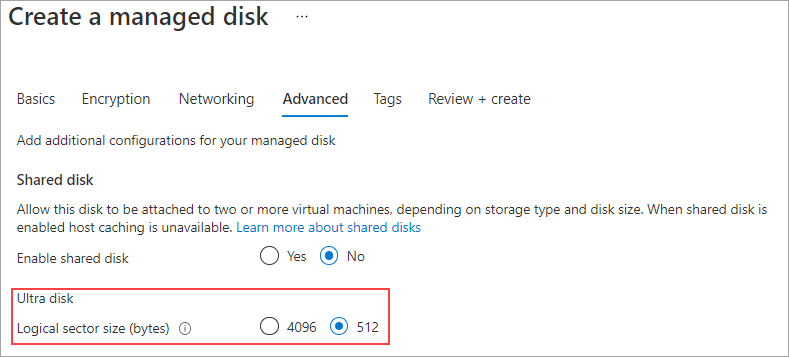 Ultra Disks support a 4k physical sector size by default but also supports a 512E sector size. Most applications are compatible with 4k sector sizes, but some require 512-byte sector sizes. Oracle Database, for example, requires release 12.2 or later in order to support 4k native disks. For older versions of Oracle DB, 512-byte sector size is required.