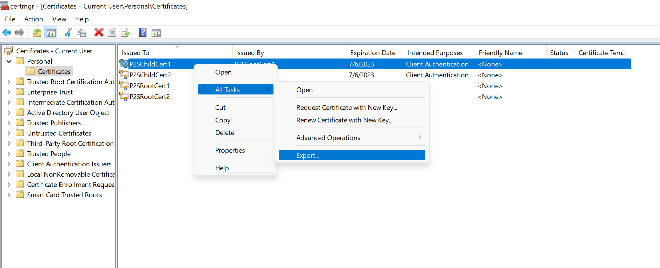 To export a client certificate, open Manage user certificates. The client certificates that you generated are, by default, located in 'Certificates - Current User\Personal\Certificates'. Right-click the client certificate that you want to export, click all tasks, and then click Export to open the Certificate Export Wizard.