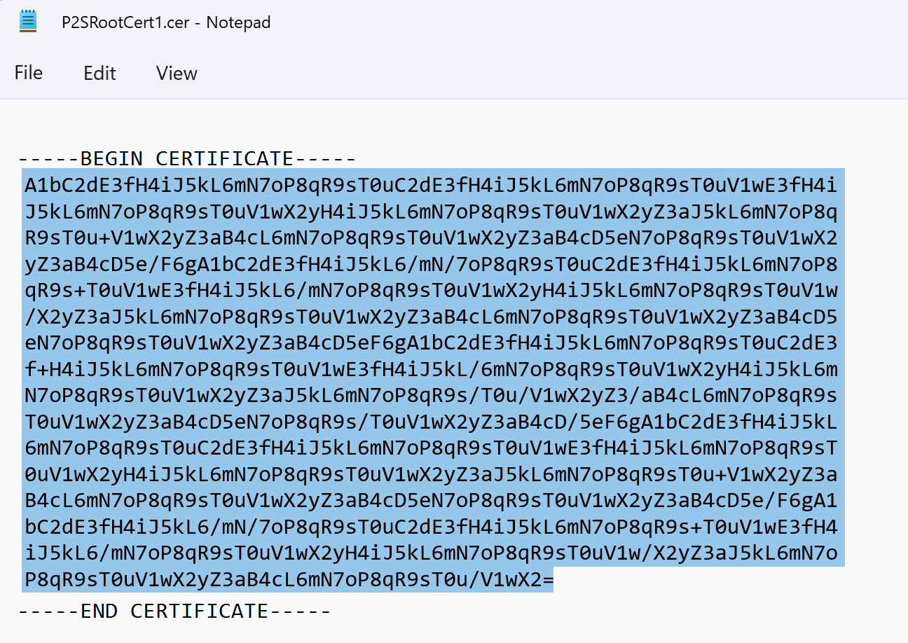 Go to the location where you exported the certificate and open it using a text editor, such as Notepad. If you exported the certificate in the required Base-64 encoded X.509 (.CER) format, you see text similar to the following example. The section highlighted in blue contains the information that you copy and upload to Azure.
